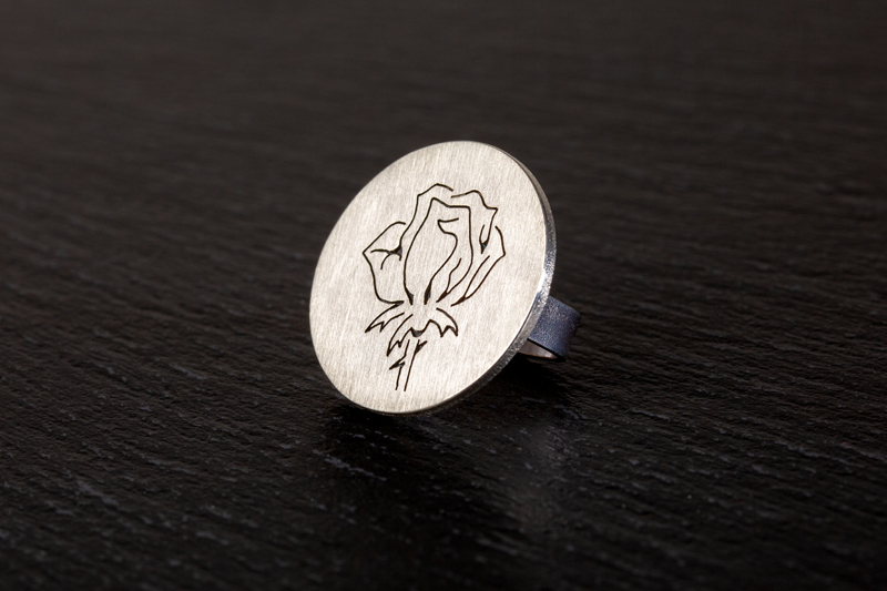 Monsieur et Madame M. ont souhaité que les anneaux soient en argent. Madame aime les coquelicots et pour Monsieur elle a pensé à un anneau en forme de jante de vélo. Ainsi les idées de création peuvent venir d'un souvenir d'une personne chère ou bien de fleurs que nous aimons tout particulièrement. L'anneau de Madame aux motifs de coquelicots est inspiré des bagues VARIATIONS. Exemples d'autres motifs floraux demandés : hibiscus, orchidée... Et pour l'anneau de Monsieur, que l'on a appelé "Papy vélo", nous rappelle la jante de vélo grâce au sillon central. Cette forme d'anneau a été reprise et détournée plusieurs fois pour donner vie à d'autres bagues et anneaux. Vous pouvez donc proposer vos idées et nous nous chargeons de les réaliser.