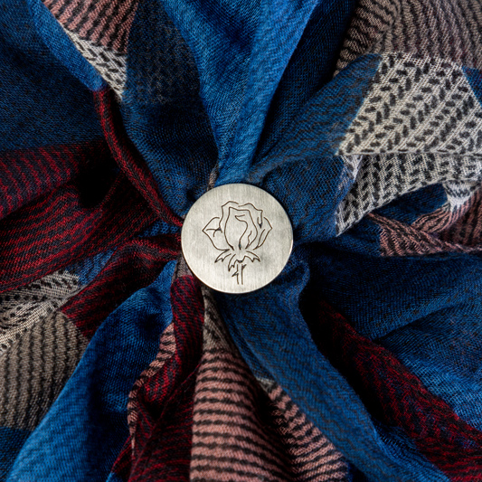 Madame P. aime porter des foulards. Souvent, elle utilise une pince de foulard au lieu de les nouer. Comme sa pince actuelle ne pinçait pas suffisamment ses foulards, elle m'a demandé si je pouvais lui faire ce genre d'article. Je lui ai plutôt proposé un système coulissant avec un plateau ornemental et le motif de son choix. Elle préférait un plateau rond. Et pour le motif, l'idée de la rose lui plaisait bien, mais plutôt le bouton de rose. C'est ainsi que cet objet à la fois utilitaire et ornemental a trouvé son porteur.