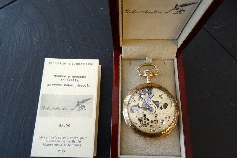 Pour le Concours de l'Objet Touristique 2019, la Maison de la Magie Robert-Houdin de Blois a proposé un objet très particulier à faire fabriquer. Comme c'est aussi un musée de l'Horlogerie, l'objet en question est une montre à gousset ou montre de poche transparente pour laisser apparaître le mécanisme. Et la particularité de cette montre c'est qu'elle devait être personnalisée par la signature de Robert-Houdin. Marguerite Sitthy a été sélectionnée pour réaliser cet objet. Son idée était de restaurer et transformer des montres à gousset anciennes en montres squelettes et personnalisées par le marquage laser.