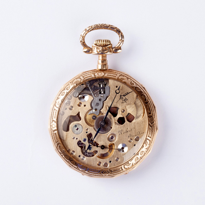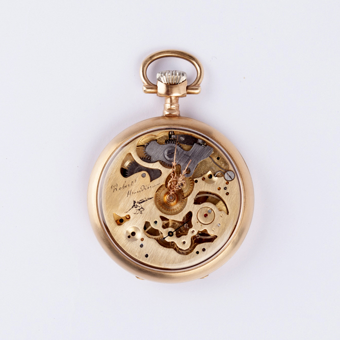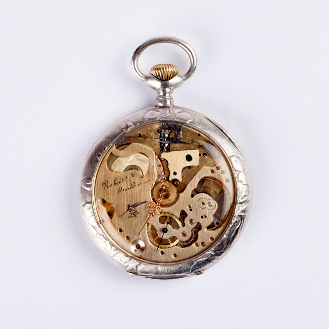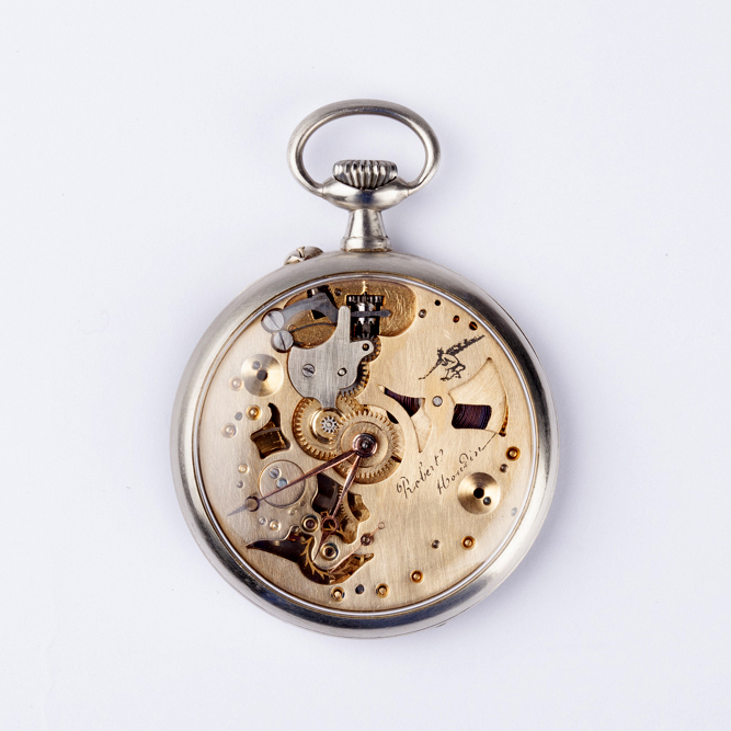 Le travail de personnalisation de la montre de poche repose sur l'introduction de la signature « Robert Houdin » avec le Diablotin. C'est ainsi qu'il a été décidé de ne pas mettre de cadran pour mettre plus en valeur la signature et le travail de squelette. Le diamètre de la platine devait donc être de 4 cm minimum pour que la gravure soit lisible. La platine, plaque où le squelette est découpé, est parfois en laiton argentée. Pour qu’elle s’accorde avec le boitier, on lui redonnera sa couleur jaune d’origine. Le boitier devait donc mesurer 4,5 cm de diamètre minimum.