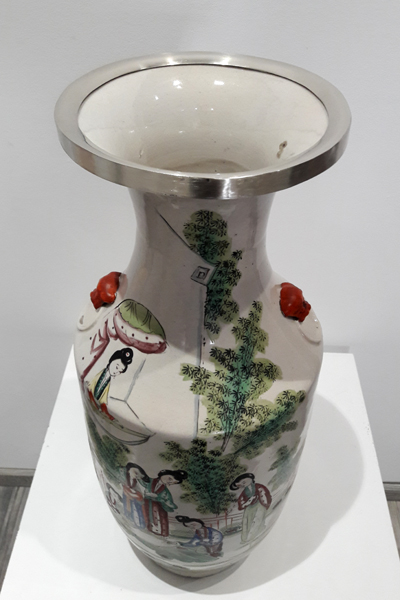 Collage pierres/perles fantaisie/céramique, rivetage métal.